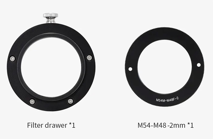 The M54 2" Filter Drawer from ZWO goes between your camera and telescope and makes it easy to drop in a filter for astrophotography. Strong magnets and a lock screw keep the filter securely in place, and the drawer is designed to prevent light from leaking in during long exposures. The drawer has an internal M48 x 0.75 thread to hold standard 2" filters. The sides bear M54 x 0.75 threads�male for the camera side and female for the telescope side. An M54 male-M48 female adapter is included.